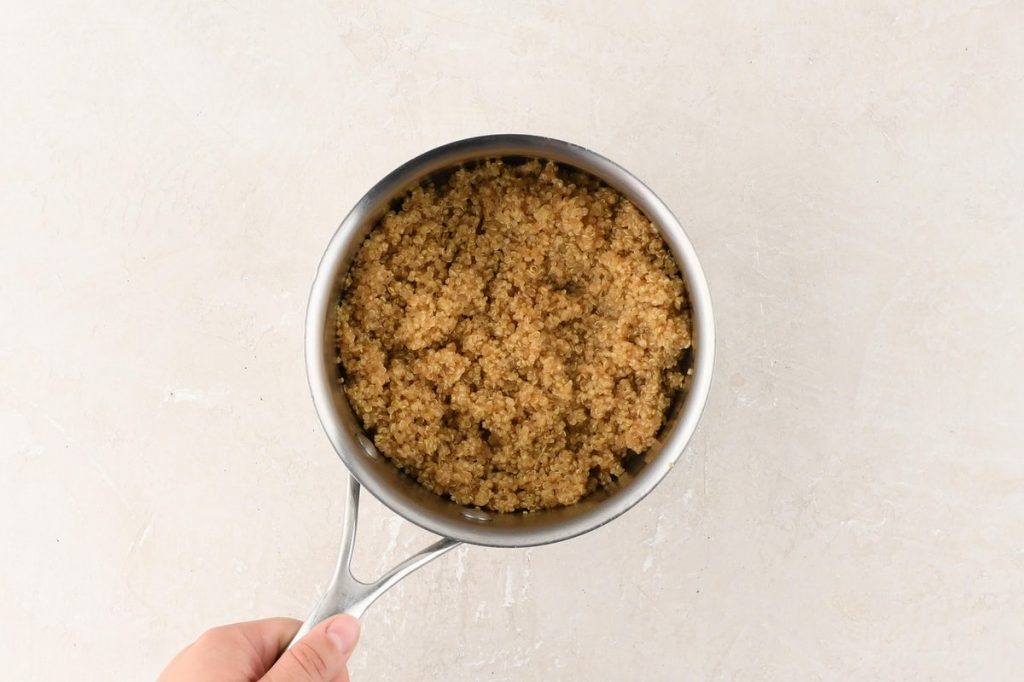 En una olla pequeña colocá la quinoa , 1½ tazas de agua, el caldo vegetal, ¼ cucharadita de sal y una pizca de pimienta, y llevá a ebullición a fuego alto. Cubrí y reducí el fuego a medio-bajo. Cociná hasta que la quinoa esté tierna, 14-16 minutos. Retirá del fuego y reservá tapado para conservar el calor.