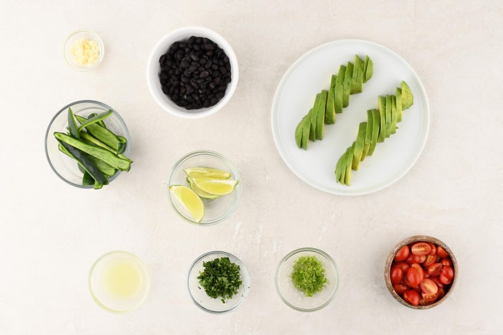 Rallá y cortá a la mitad el limón (necesitás 1 cucharadita de ralladura de limón). Cortá una mitad en cuatro partes y exprimí el jugo de la otra mitad. Picá el cilantro(sin el tallo). Picá el ajo. Escurrí los porotos negros. Cortá a la mitad los tomates. Cortá a la mitad la palta, desechá el carozo y la cáscara, y cortala en rodajas. Cortá el pimiento a lo largo, desechá el tallo y las semillas, y cortá el tiras finas. Hacé la vinagreta de cilantro En un bowl para mezclar, combiná 2 cucharadas de jugo