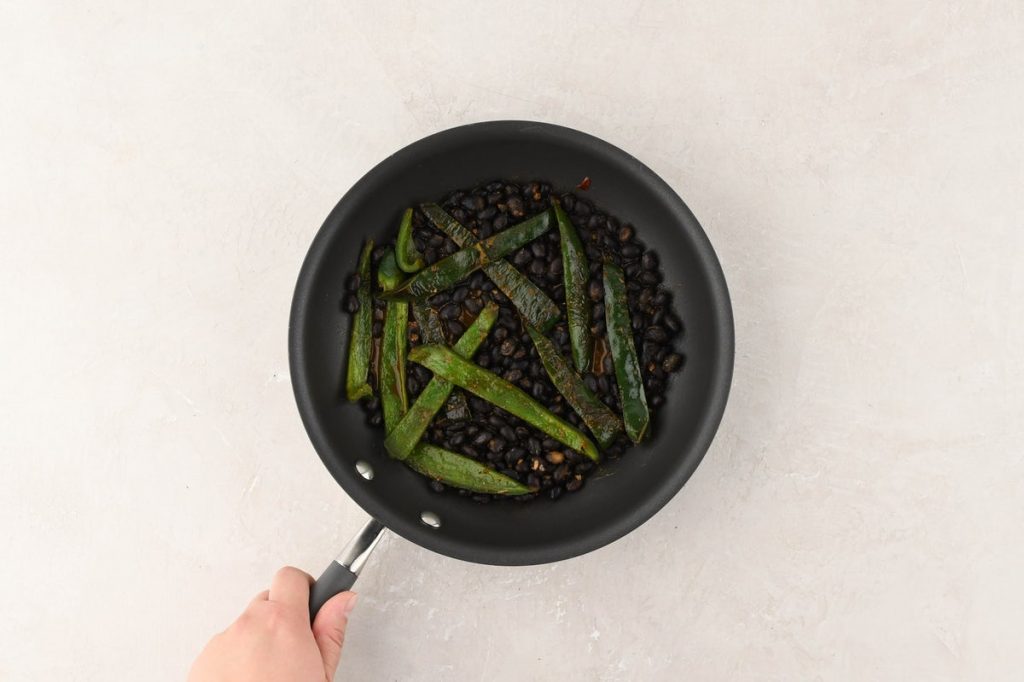 Colocá una sartén antiadherente mediana a fuego medio. Añadí 1 cucharada aceite de oliva y el ajo restante a la sartén caliente. Revolvé hasta que esté fragante, 30-60 segundos. Agregá el pimiento y revolvé ocasionalmente hasta que se ablande, 3-5 minutos. Agregá los porotos negros, ¼ de taza de agua, la mezcla de condimentos y una pizca de sal. Llevá a ebullición. Una vez que hierva, reducí el fuego a bajo, tapá y cociná hasta que se caliente por 5 minutos. Retirá del fuego.