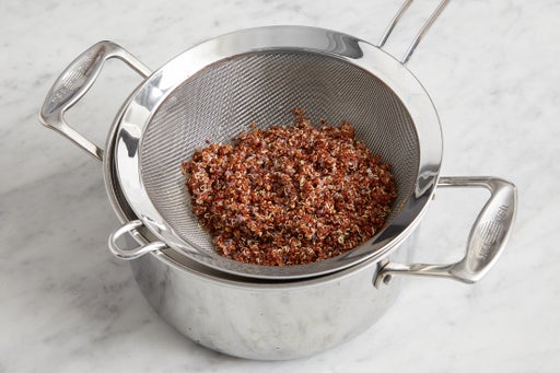 Mientras la calabaza se asa, lavá la quinoa bajo el grifo usando un colador, hasta que el agua salga lo más transparente posible. Agregá la quinoa a la olla de agua hirviendo y cociná, sin tapar, de 14 a 16 minutos, o hasta que esté tierna. Apagá el fuego. Escurrí bien y volvé a ponerla en a la olla. Agregá el queso (desmenuzando antes de agregar). Rociá con aceite de oliva y sazoná con sal y pimienta; revolvé para combinar. Cubrí para mantener el calor.
