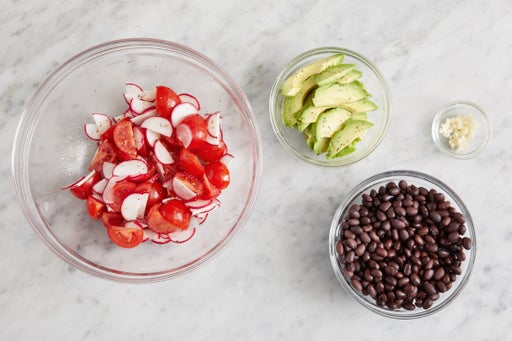 Mientras se cocina la quinoa, pelá y picá 2 dientes de ajo . Escurrí y enjuagá los porotos y cortá el limón al medio. Cortá la palta a la mitad y desechá el carozo. Con una cuchara, retirá la palta de la piel, luego cortá en rodajas finas. Colocala en un bowl, cubrí con el jugo de 2 rodajas de limón y condimentá con sal y pimienta. Cortá a la mitad los rabanitos a lo largo, y luego en rodajas finas. Cortá al medio los tomates y combinalos con los rabanitos en un bowl con el jugo de limón restante. Condimentá con aceite de oliva y salpimentá. Reservá a un lado, revolviendo ocasionalmente, al menos 10 minutos.