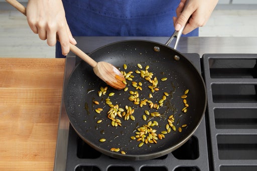 Mientras la salsa se marina, en una sartén mediana (antiadherente, si tenés), calentá un chorrito de aceite de oliva a fuego medio-alto hasta que esté caliente. Agregá las semillas, condimentá con sal y pimienta. Tostalas, revolviendo ocasionalmente, de 2 a 3 minutos, o hasta que estén ligeramente doradas y fragantes (tené cuidado, ya que las semillas pueden reventar al tostar). Reservalas e inmediatamente sazoná con sal y pimienta. Limpiá la sartén.