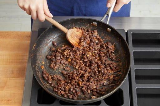 En la misma sartén, calentá un chorrito de aceite de oliva a fuego medio-alto hasta que esté caliente. Agregá el ajo picado, condimentá con sal y pimienta. Cociná, revolviendo constantemente, de 30 segundos a 1 minuto, o hasta que se ablanden. Agregá los porotos, 1/3 de taza de agua y la mezcla de especias restante. Condimentá con sal y pimienta. Cociná revolviendo ocasionalmente y machacando los porotos con el dorso de una cuchara, de 3 a 4 minutos, o hasta que el líquido se haya cocinado. Apagá el fuego. Probá y sazoná con sal y pimienta si lo deseas.