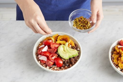 Serví la quinoa cocida cubierta con la calabaza asada , los porotos cocidos, la palta sazonada y el marinado de tomate y rabanito (incluido su líquido). Decorá con las semillas tostadas . ¡Disfrutá!