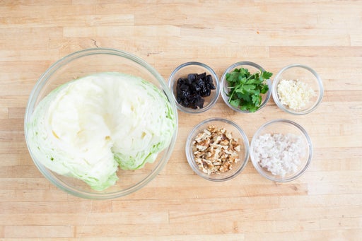 • Picá finamente las ciruelas. Pelá y picá el ajo y la cebolla. Quitá las hojas de perejil de los tallos. Cortá el corazón del repollo, dejando intacto el resto de la cabeza. Picá las nueces en trozos grandes.