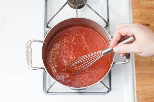 Agregá la pasta de tomate, la salsa de tomate, el azúcar, el vinagre de vino tinto y 1 taza de agua (250 ml). Llevá la mezcla a ebullición, luego reducí el fuego a medio. Cociná a fuego lento de 7 a 10 minutos, o hasta que espese un poco, sazoná con sal y pimienta a gusto.