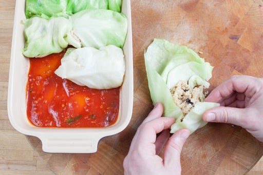 Separá las hojas de col cocidas, luego, trabajando 1 hoja a la vez, colocá 3 cucharadas de relleno en el centro de la hoja, enrollá bien y colocá en la fuente para hornear, con la costura hacia abajo. Cubrí los rolls de repollo rellenos con la salsa de tomate restante y colocá la fuente en el horno de 15 a 17 minutos, o hasta que la salsa burbujee y los rolls estén bien calientes.