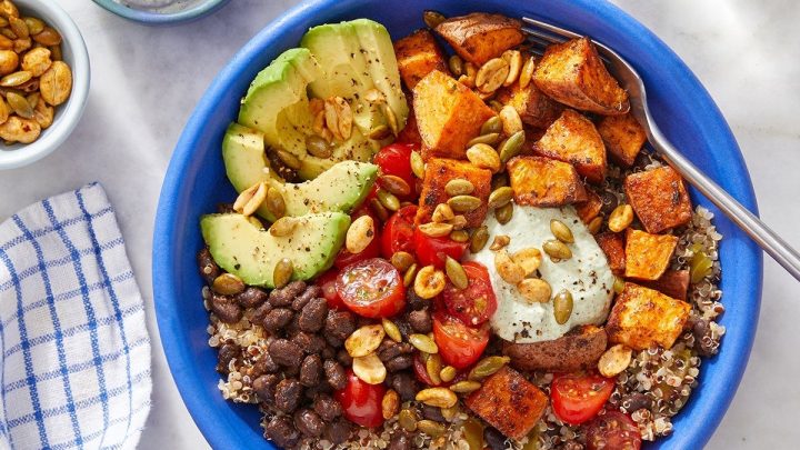 Ago 02 2024 Desactivado 25 – Min Balanced Bowl de Quinoa • 25 gr de proteína • Por HolaVeggie con Batata Horneada, Porotos y Palta