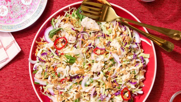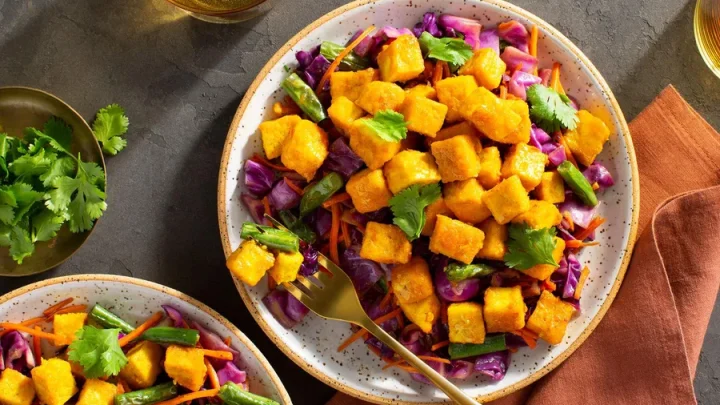 Dic 13 2024 Desactivado 15 – Min Ensalada Goi Ga Vietnamita de Pollo Vegetal • 32 gr de proteína • Por HolaVeggie con Cebolla Frita y Repollo