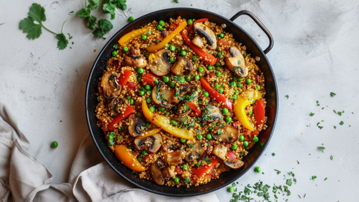 Nov 15 2024 Desactivado One Pot Paella de Quinoa y Hongos ¡Imperdible! Por HolaVeggie con Morrón, Romero Fresco y Especias