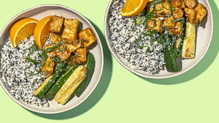 Sep 27 2024 Desactivado Spicy Tofu a la Naranja • 31 gr de proteína • Por HolaVeggie con Zuquini Asado y Arroz con Quinoa