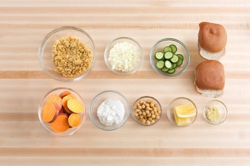 Precalentá el horno a 230 ° C. Lavá y secá los productos frescos. Partí por la mitad los panes de hamburguesa. Escurrí y enjuagá los garbanzos. Transfierí ⅔ de los garbanzos a un bowl grande y aplastá con un tenedor; dejá los garbanzos restantes enteros. Pelá y picá el ajo; usando el lado plano de tu cuchillo aplastalos hasta que se parezca a una pasta. Cortá en cuartos y sacale las semillas al limón. Cortá el pepino en rodajas finas. Cortá las batatas en rodajas de 1½ cm de grosor. Pelá y cortá en cubos pequeños la cebolla. En un bowl mediano, combiná el alioli, el jugo de 2 rodajas de limón y ¼ de la pasta de ajo, agregá un chorrito de aceite de oliva y revolvé para combinar bien. Sazoná con sal y pimienta a gusto.