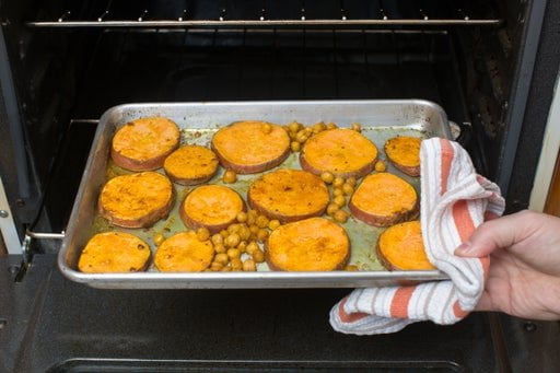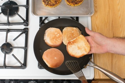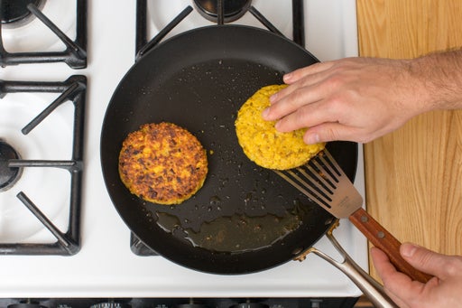 Mientras las batatas y los garbanzos continúan asándose, en la misma sartén para cocinar los aromáticos, calentá 2 cucharaditas de aceite de oliva a fuego medio-alto hasta que estén calientes. Con cuidado agregá los medallones. Cociná de 3 a 4 minutos por lado, o hasta que estén dorados y calientes. Retiralos del calor y reservalos en un lugar cálido para que no se enfríen.