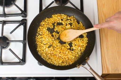 Mientras se asan las batatas y los garbanzos, en una sartén grande (antiadherente, si tenés), calentá 2 cucharaditas de aceite de oliva a fuego medio-alto hasta que estén calientes. Agregá la pasta de ajo restante, la cebolla y el polvo de masala. Cociná, revolviendo ocasionalmente, de 3 a 5 minutos, o hasta que estén suaves y fragantes. Transferí al bowl con garbanzos machacados. Limpiá la sartén.