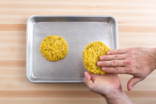 Mientras las batatas y los garbanzos continúan asándose, agregá la harina de garbanzos y el queso tipo parmesano vegano al bowl con los garbanzos machacados y aromáticos cocidos; Condimentá con sal y pimienta. Mezclá hasta que esté bien combinado. Cuando esté lo suficientemente frío como para manejarlo, con las manos dividí la mezcla por la mitad y formá dos medallones de 2,5 cm de grosor.