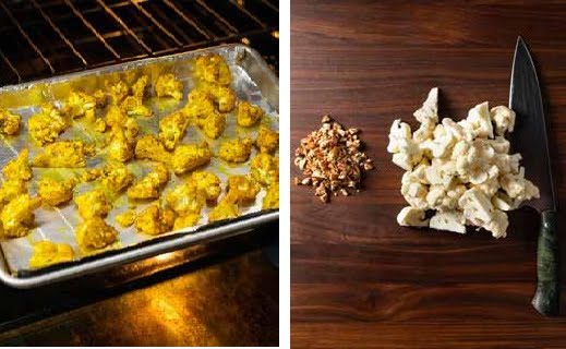 Regresá el coliflor y las nueces a la bandeja para hornear. Esparcí en un capa y poné la bandeja para hornear al horno. Asá de 5 a 7 minutos o hasta que quede el coliflor esté tierno al pincharlo con un tenedor.