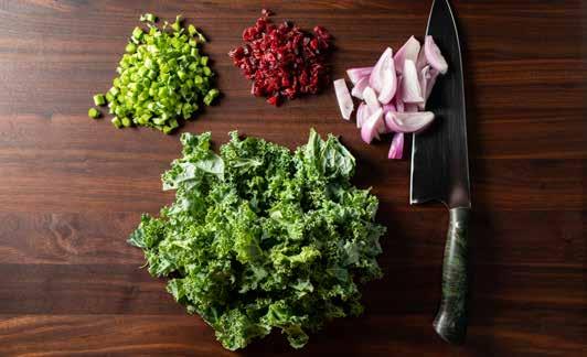 Retirá los tallos centrales de la kale. Cortá los tallos en pedazos de aproximadamente 1,5 cm. de grosor. Picá las hojas en pedazos pequeños.