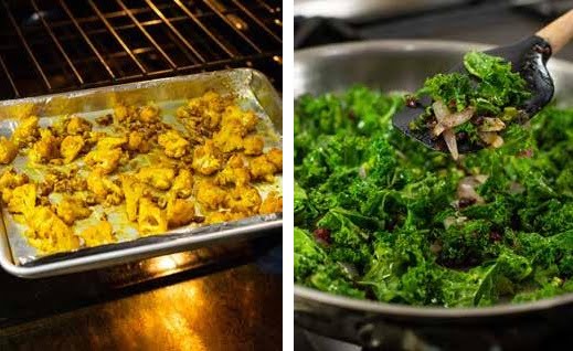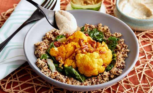 Dulce y salado armonizan en este bowl de verduras nutritivo. Espolvoreado con cúrcuma, el coliflor está cubierto con miel de caña y nueces. Para terminar, se sirve sobre quinoa arcoiris y kale salteada con arándanos secos. Un chorrito de salsa tahini-miso- sazonado con albahaca y perejil , agregan notas herbáceas en todas partes.