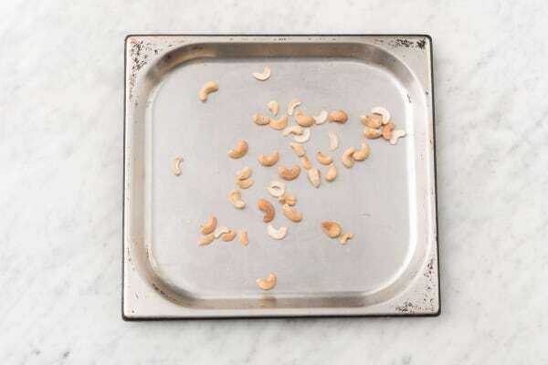 Colocá las castañas de cajú en una bandeja para hornear y tostalas en el horno hasta que estén doradas, aproximadamente 5 minutos. Retirá la bandeja y reservá. Importante: ¡estate atento para que no se quemen! Una vez terminado, apagá el horno.