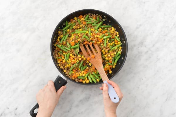 Calentá un chorrito de aceite en una sartén grande a fuego medio-alto. Agregá las zanahorias y revolvé hasta que se ablanden ligeramente, aproximadamente 5 minutos. Agregá las chauchas y el choclo, y revolvé hasta que las chauchas estén tiernas y crujientes, 4-5 minutos. Condimentá con sal y pimienta. Reservá en un bowl para que el sartén quede vacía para el próximo paso