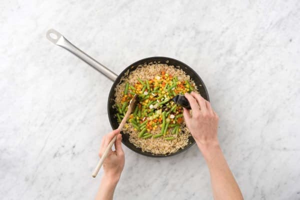 Calentá una gran llovizna de aceite en el mismo sartén a fuego medio-alto. Agregá ajo y jengibre. Cociná 1 minuto, hasta que esté dorado. Agregá el arroz cocido y revolvé hasta que esté ligeramente crujiente, 2-3 minutos. Agregá las verduras cocidas, salsa de soja y la parte blanca de las cebollas de verdeo. Mezclá otros 1-2 minutos.